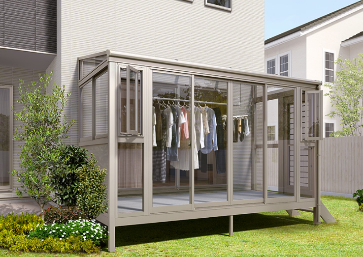テラス囲いは、屋根と三方の壁(ガラスやパネル)で囲われています。窓を閉めれば、外気とは遮断された空間になります。これにより、空中に舞っている花粉、黄砂、PM2.5が洗濯物に直接付着するのを物理的に防ぐことができます。