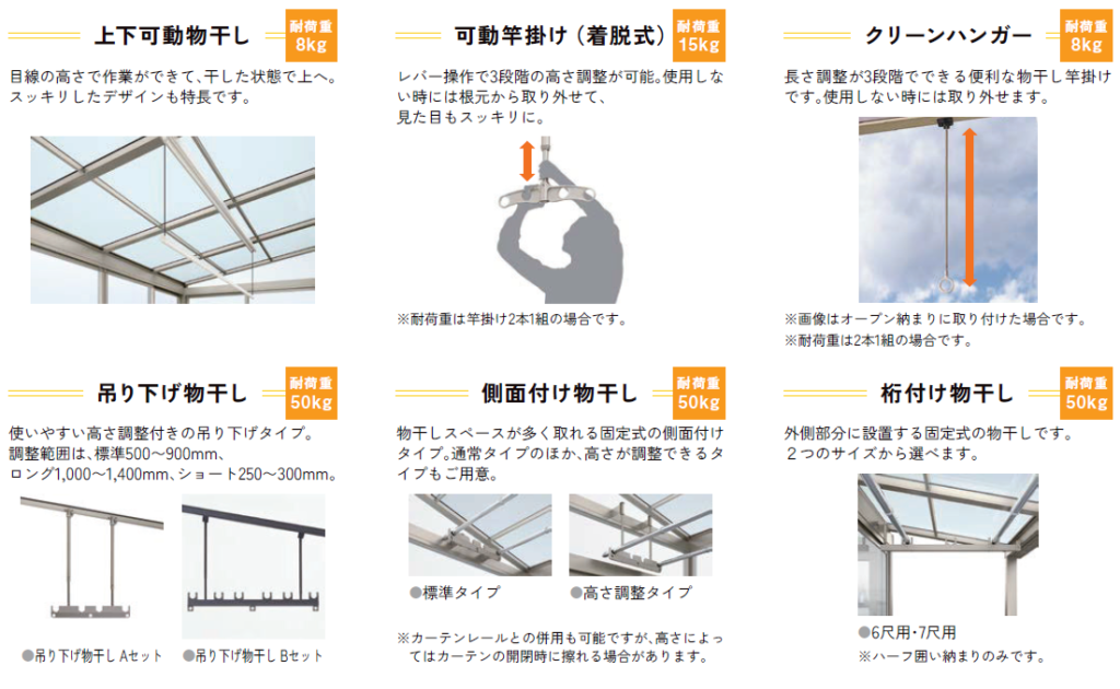 • 物干しオプションの種類と耐荷重の違いを比較